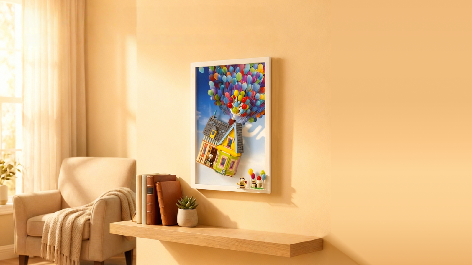 Display Frame for LEGO 43217 Up House, Brushed Aluminum Wallboard with Cloud Backdrop and 2 Display Shelves, Protective Wall Mount Showcase for Up House LEGO Set