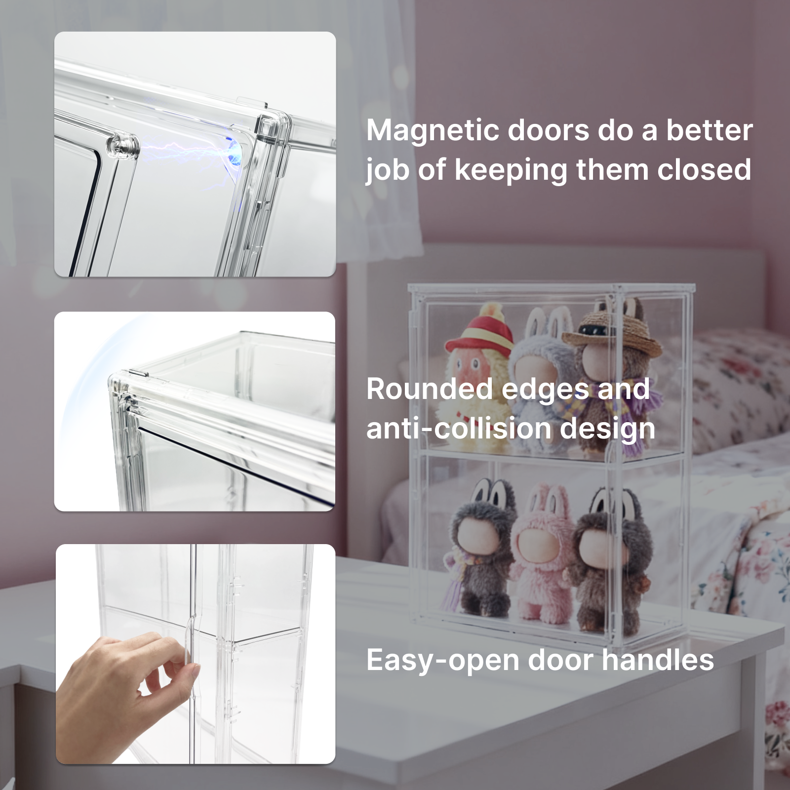 Clear Acrylic & Magnetic Door: High clarity acrylic offers a perfect view, showcasing every detail of your favorite figures, and keeping every figure visible.The magnetic door keeps your precious collectibles away from dust and allows for easy access or updating of display.