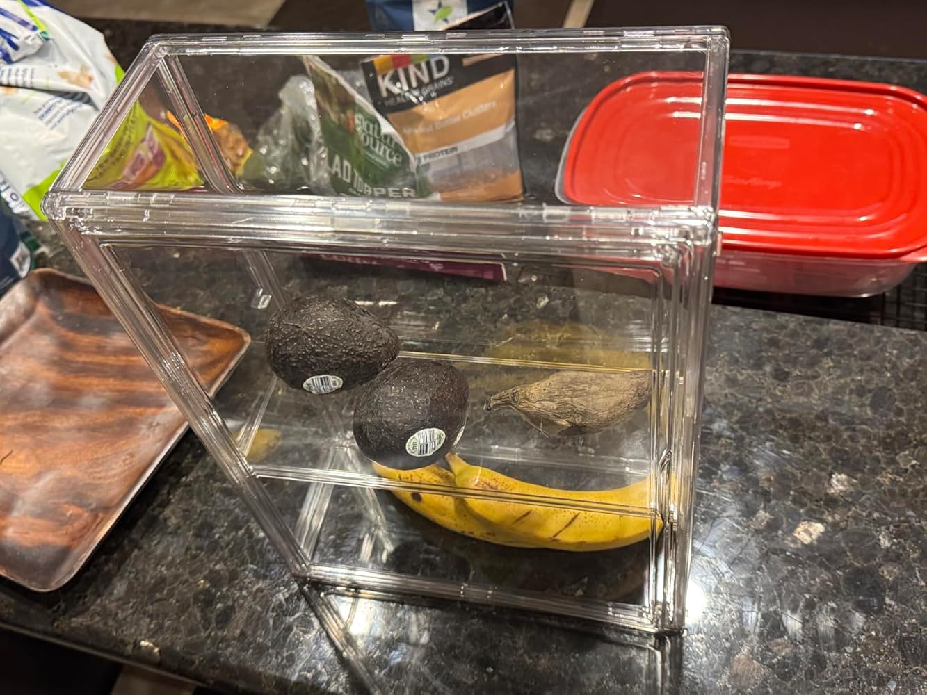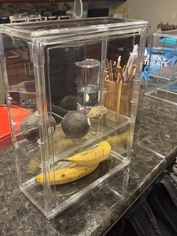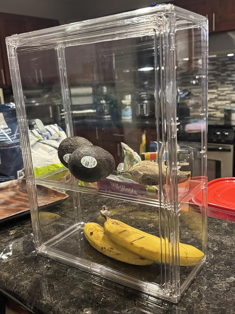 This showcase organizer is a great way to store or display just about anything in your home. The acrylic is very clear, and assembly was extremely easy. The door uses small magnetic fasteners at the corners, which keep it securely closed.I’m currently using mine in the kitchen and dining area to store bananas and other fruit. It keeps everything visible while helping prevent fruit flies — a big plus. I can also see it being perfect for my wife’s jewelry, makeup, or everyday items that need tidier organization. I’ll likely keep this one in the dining area for my wife’s baked goods like cookies and cupcakes, in addition to fruit.Overall, this is a versatile and attractive organizer that can help declutter and showcase a wide variety of items.
