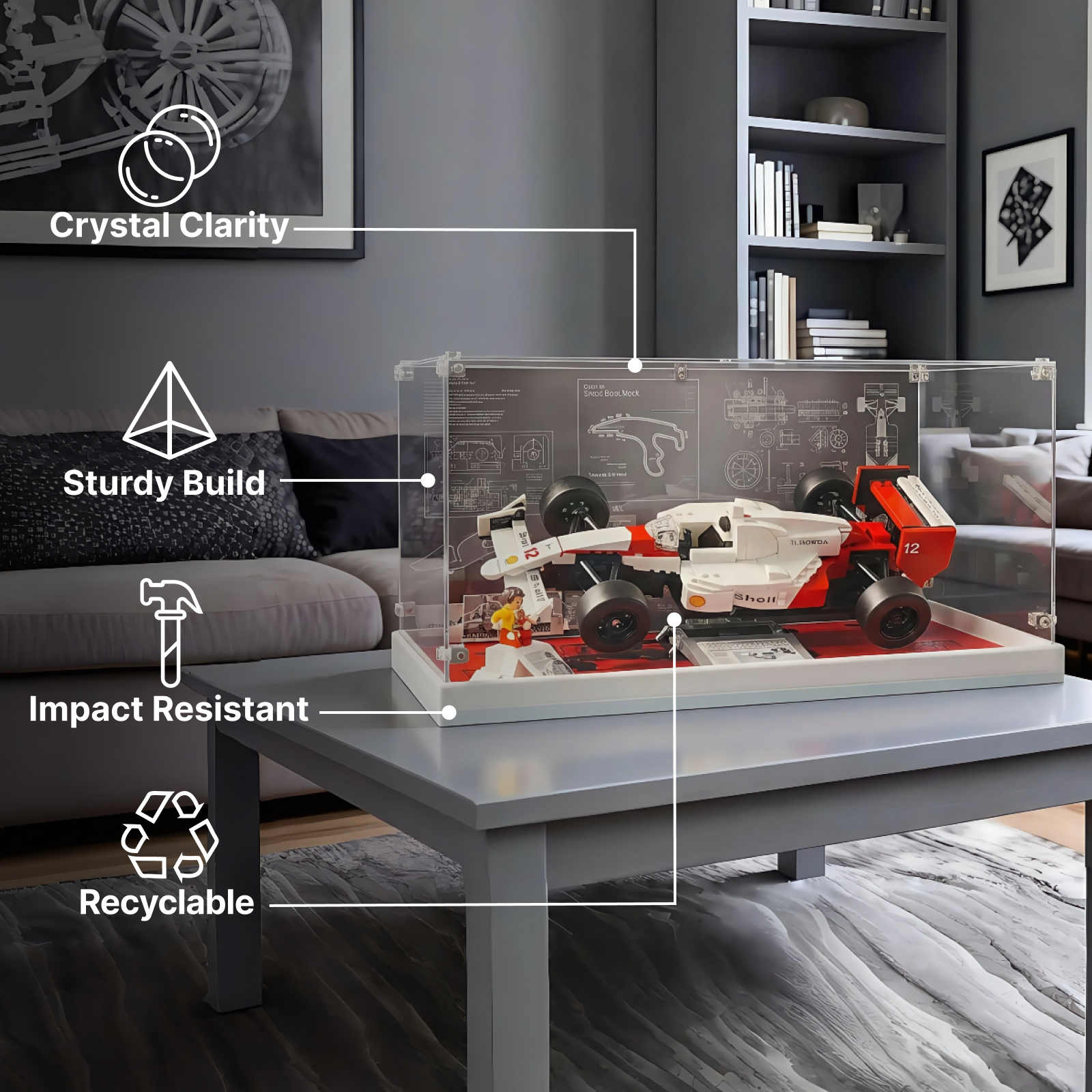 Brushed Aluminum Alloy Frame: Sleek modern design with excellent durability and stability, safeguarding your LEGO display.